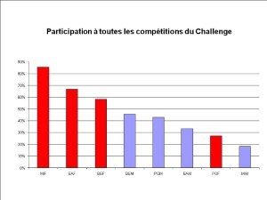 Lecture : sur un total de 9 licenciées EAF, 6 ont participé aux 5 compétitions du challenge, 1 n’a participé à aucune compétition |