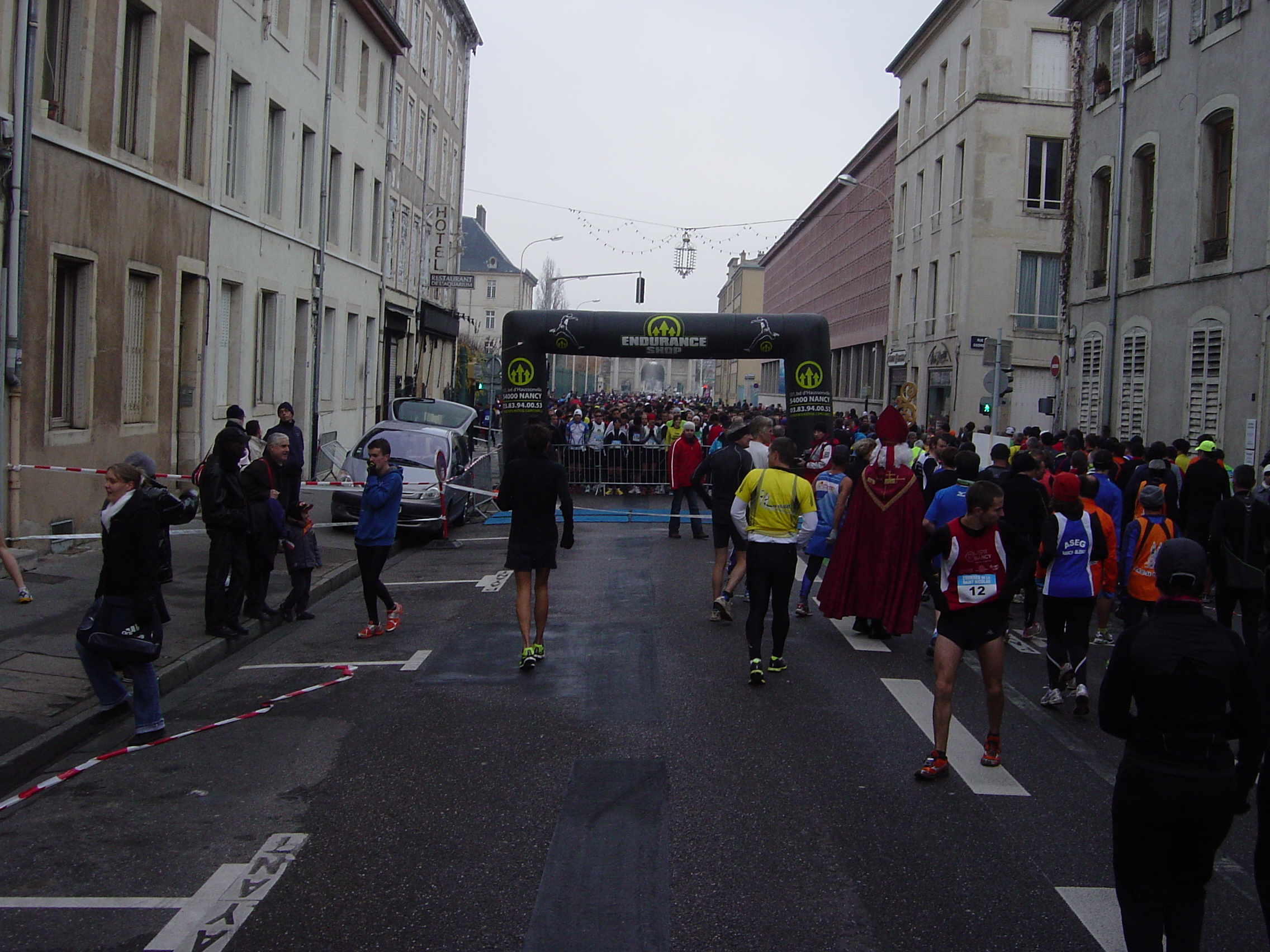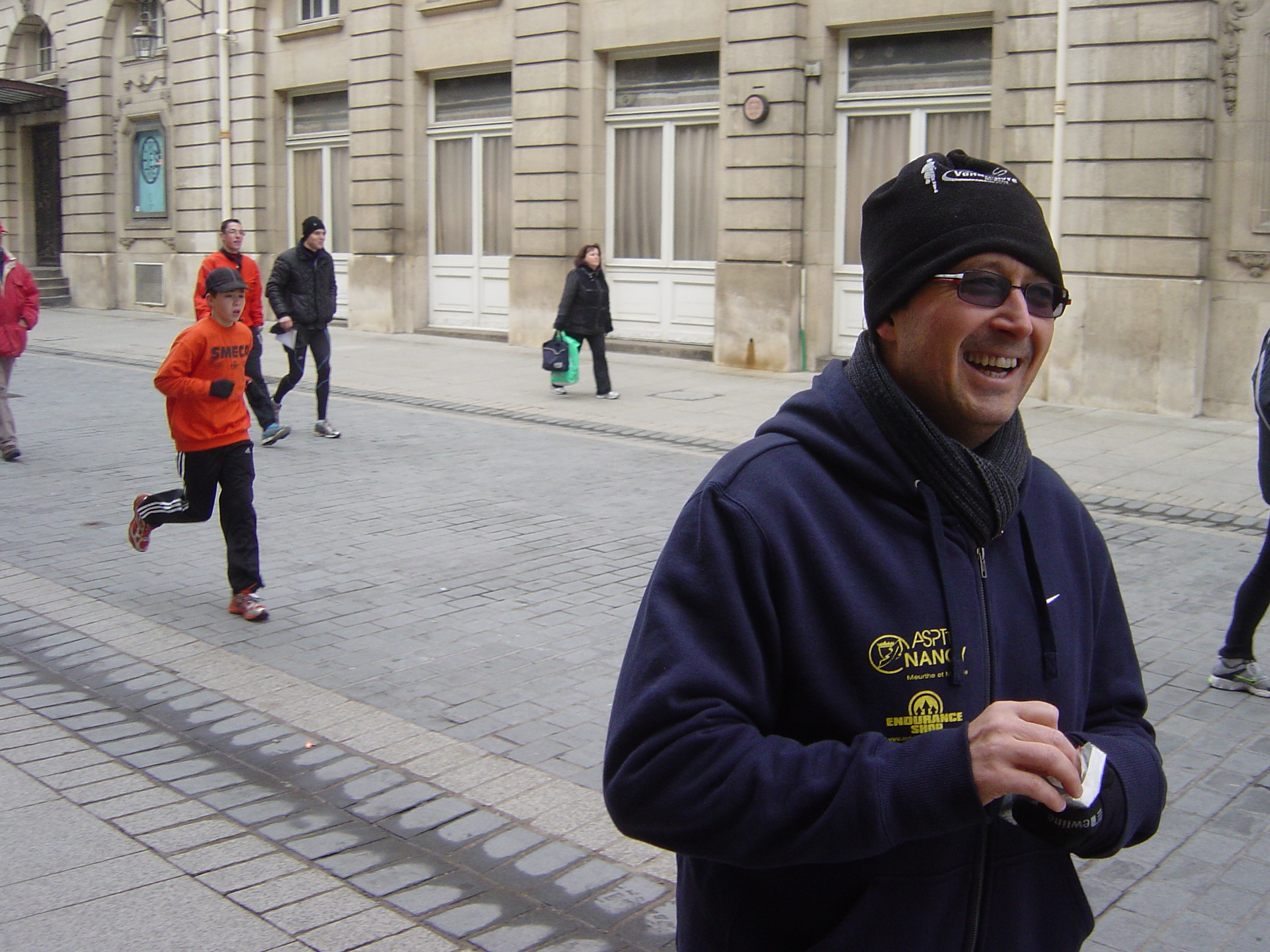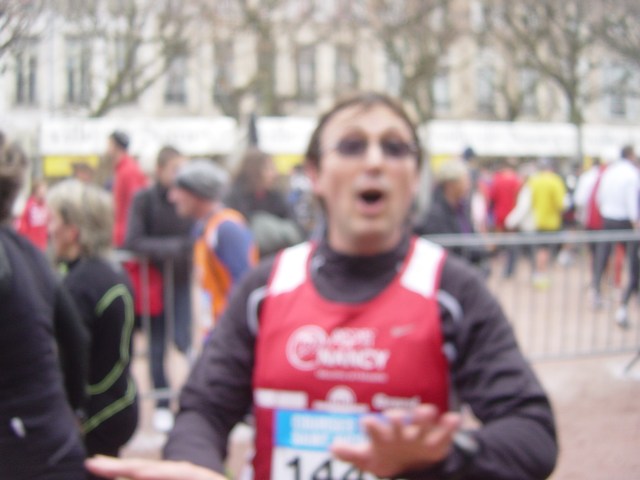 Dans le rue Sainte Catherine, je suis devant, je me retourne, il a perdu quelques mètres. Est-ce qu’il coince ? Mais non, il revient Place Stan, continue sur sa lancée, me passe, ne faiblit pas à l’entrée de la place Carrière. On passe la ligne, dernier kilo en 4’37’’. Temps total 48’54 à mon chrono. Lui, a oublié d’arrêter le sien, il attendra le verdict de la puce mais objectif largement rempli. Bravo mon gars !