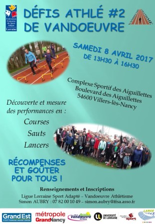 Le 8 avril prochain se dérouleront les Défis Athlé, rencontre organisée par notre club, en partenariat avec la Ligue Lorraine du Sport Adapté.