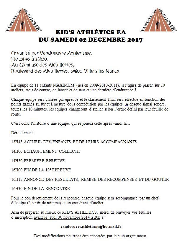 Nous recherchons des bonnes volontés pournous aider à gérer les ateliers : si vous êtes intéressés pour nous aider (car il nous faut malgré tout un minimum de 40 bénévoles pour fonctionner) envoyez nous rapidement un mail à → vandoeuvreathletisme@hotmail.fr
