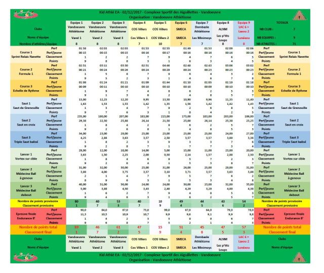 Et, lorsque nous regardons les résultats, quelle performance : une équipe 7e mais surtout les deux autres équipes tout en haut du classement, 1ère et 2e ! Nos jeunes se sont dépassés, à l’image de l’équipe 1 qui remporte tout simplement 9 des 10 épreuves ! La seule épreuve qu’elle ne remporte pas, elle fini 2e derrière ….. notre équipe 2 ! Un très grand BRAVO à nos 24 EA qui ont répondu présents !