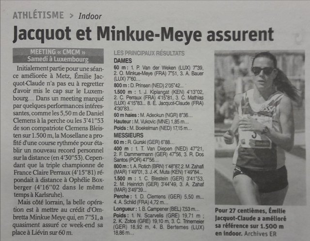 - Le Championnat LARGE en salle à Metz où Oriane G. termine 1ère de la finale 2 du 200 en 25 »05. Justin E. et Mathurin Q. réalisent également de belles performances avec 23 »92 au 200 7 »53 au 60 et 10m80 au poids pour le premier et 23 »55 au 200 pour le second !