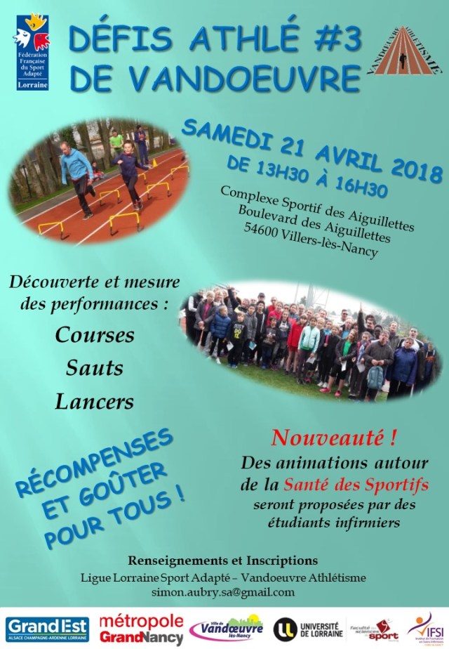 → Pour les EA PO : Samedi 21 Avril : Défis Athlé #3 à Vandoeuvre (le club étant organisateur, nous appelons les athlètes à partir de Minimes et les parents à venir aider à officier)