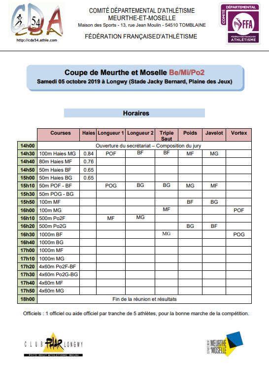 - Prochaine compétition : Sam. 15/11 1er tour Challenge hivernal U14/U16 PONT A MOUSSON