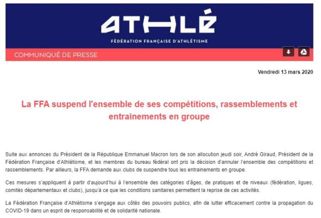 Sur recommandation des pouvoirs publics et de la Fédération Française d’athlétisme,