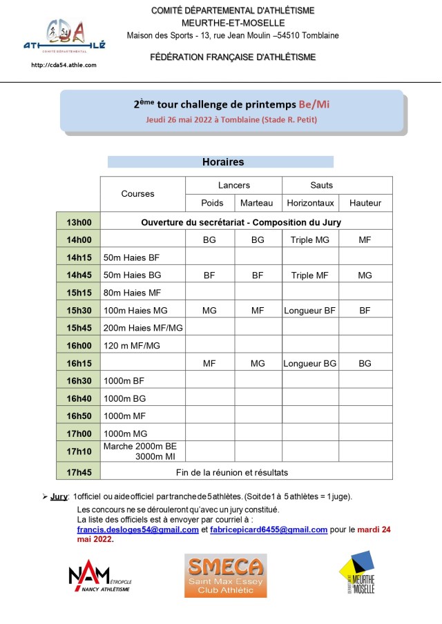Prochainement : 2ème tour du challenge de printemps Be/Mi le jeudi 26 mai 2022 à Tomblaine (Stade R. Petit)
