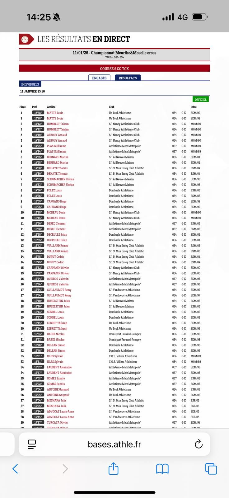 RÉSULTATS du CROSS 54 du dimanche 11 janvier 2026 à TOUL