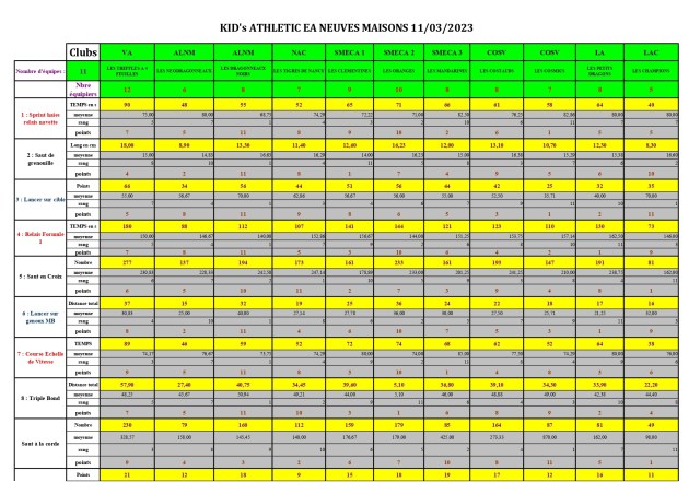 *Yélé Cp -1 000m 3’49″46 (Rp) 25 pts -longueur 3m25 (Rp) 18 pts -javelot 17m21 (Rp) 25 pts -9eme sur 42 au triathlon (Rp) 68 pts. Yélé en gros progrès bat ses 4 Rp (records personnels). Elle gagne 20″ au 1000 m, 6m de mieux au javelot et 6cm à la longueur. Elle n’en restera pas là…!