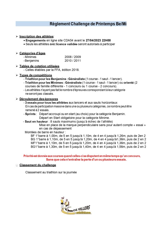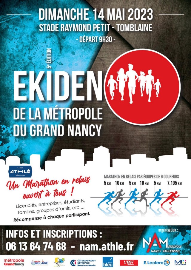 – Dimanche 7 mai 2023 : Championnat de France des Clubs 1er tour – Samedi 13 mai 2023 : Chpts 54 C/J/E/S/M – Dimanche 14 mai 2023 : Ekiden de la Métropole du Grand Nancy à Tomblaine – Jeudi 18 mai 2023 : Championnats Be/Mi à Neuves-Maisons – Samedi 20 mai 2023 : Chpts de France des Clubs N3 2e tour – Dimanche 21 mai 2023 : Chpts de France des Clubs N2, N1 et Elite 2e tour – Samedi 27 mai 2023 : Rencontre EA/Po à Toul – Samedi 3 juin 2023 : Triathlon Po à Vandœuvre-lès-Nancy – Mardi 6 au vendredi 9 juin 2023 : Championnats de France UNSS à Tomblaine – Vendredi 9 juin 2023 : Meeting Label Régional de Toul – Samedi 17 juin 2023 : Kid Athlé EA à Pompey (Avant-Garde) – Samedi 17 juin 2023 : Championnats LARGE Minimes à Lunéville – Dimanche 18 juin 2023 : Meeting Stanislas à Tomblaine – Dimanche 25 juin 2023 : Championnats LARGE TC et Espoirs à Tomblaine
